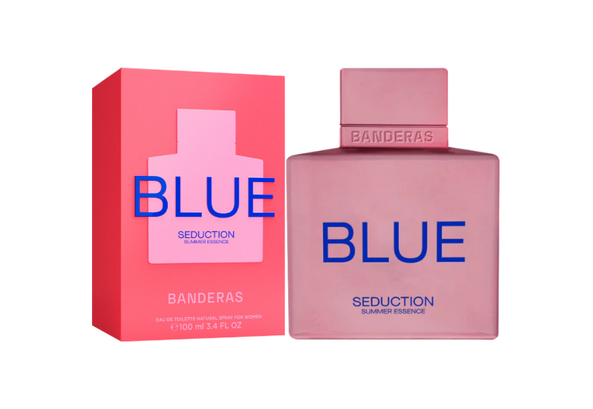 Blue Seduction Summer Essence Eau de Toilette da grife Antonio Banderas, família olfativa floral frutado, perfume feminino espanhol lançado em 2024.